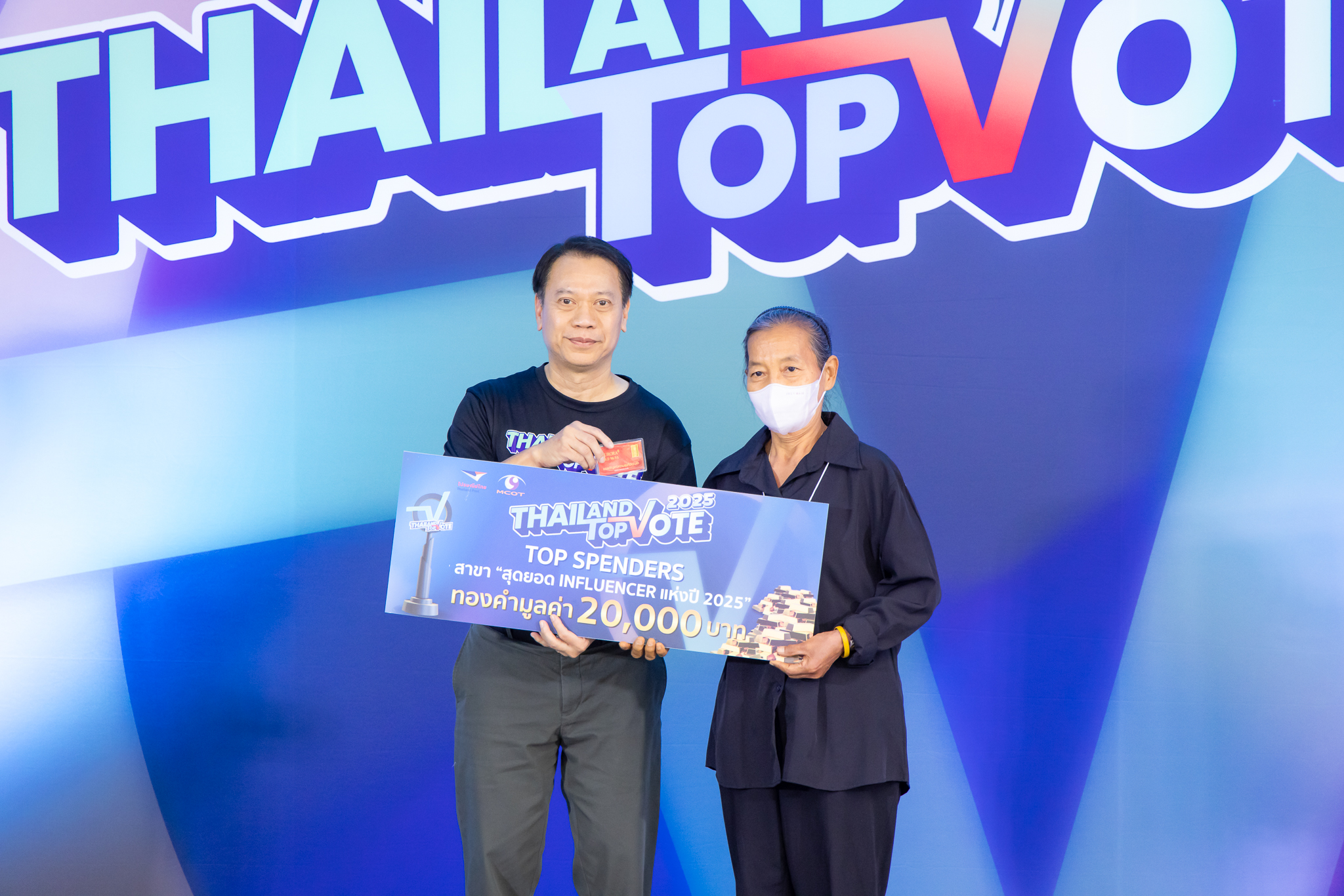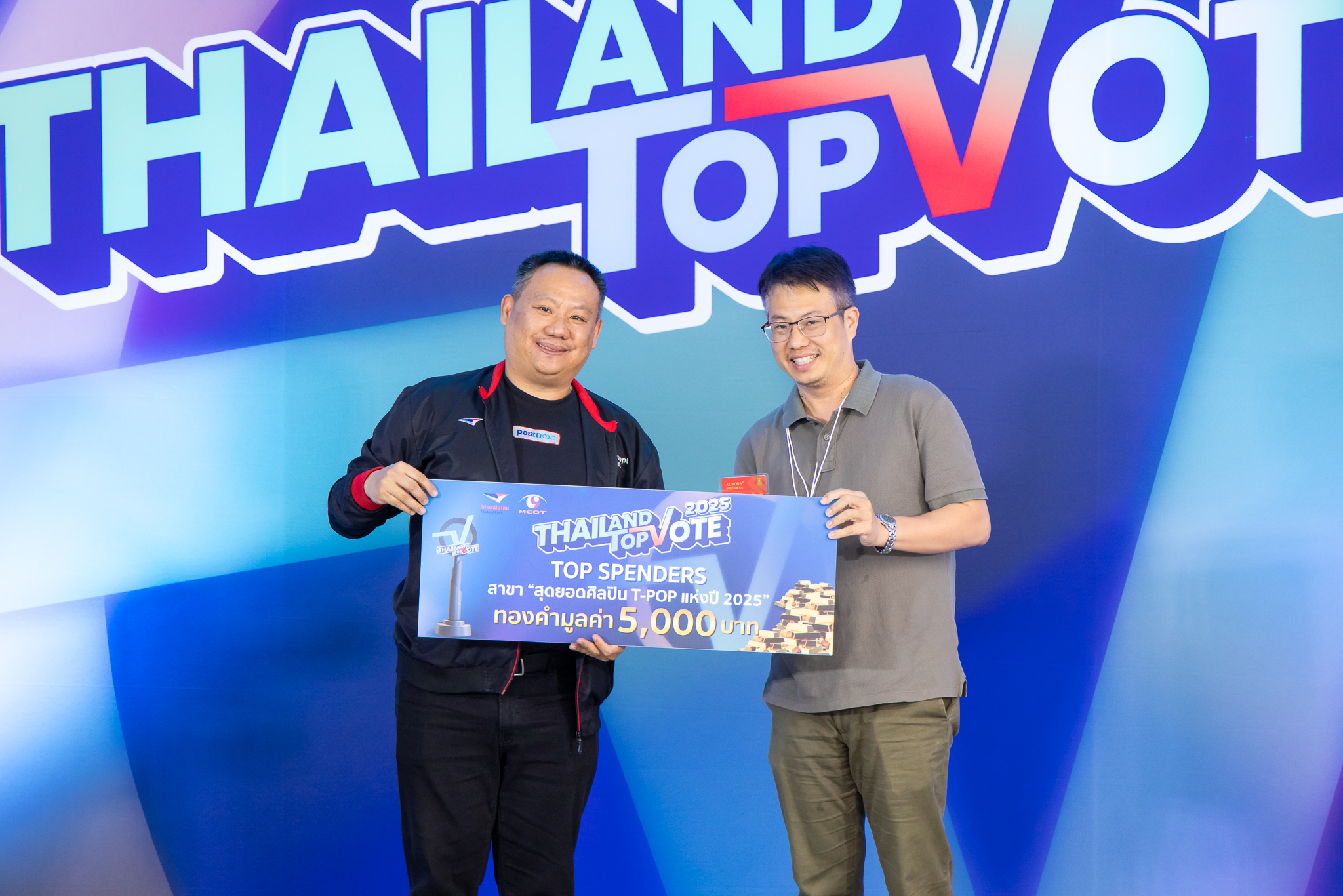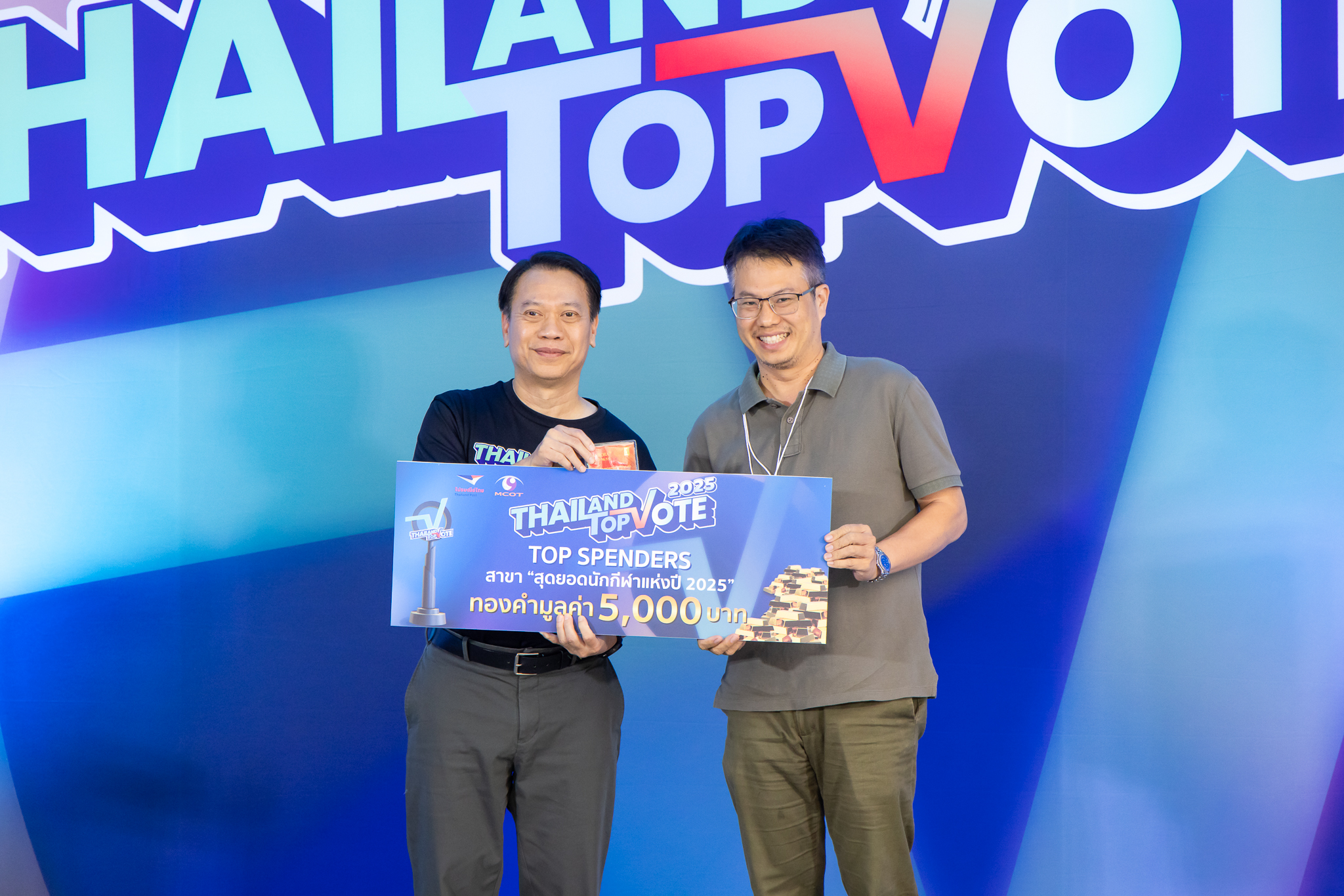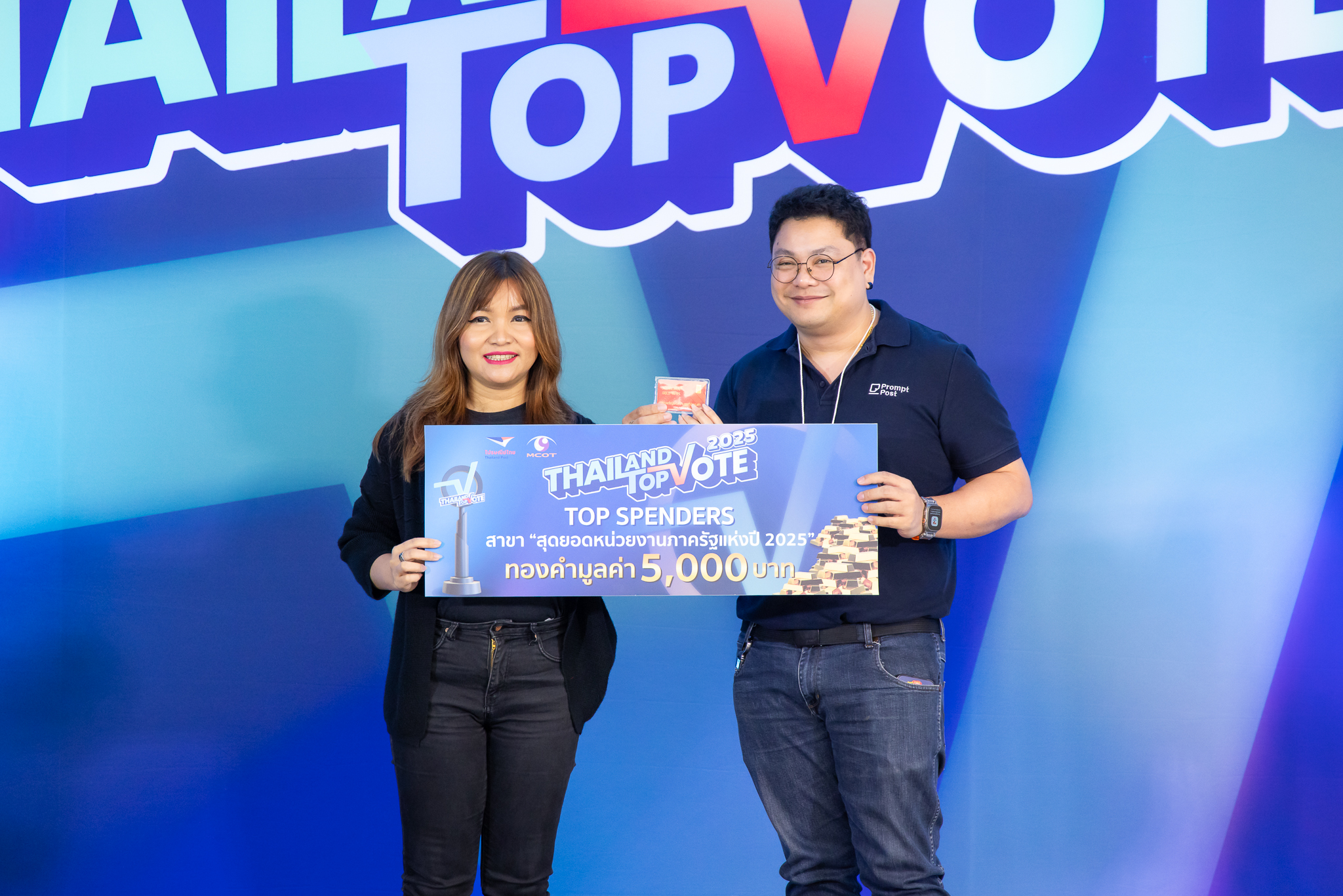 Thailand Top Vote 2025 สัปดาห์ที่ 2 แจกทองคำ มูลค่า 20,000 บาท และ 5,000 บาท ให้กับ Top Spender อันดับที่ 1 และ 2 ของทั้ง 8 สาขารางวัล โดยคุณสุวิทย์ ทรัพย์มหาอุดม ผู้ช่วยกรรมการผู้อำนวยการใหญ่ สำนักวิทยุ บริษัท อสมท จำกัด (มหาชน) พร้อมด้วย คุณภูริต มิตรสมหวัง ผู้จัดการฝ่ายโพสต์เน็กซ์ บริษัท ไปรษณีย์ไทย จำกัด และคุณจงไท เพ็งแข หัวหน้าส่วนพัฒนาแพลตฟอร์มดิจิทัล และศูนย์โพสต์เน็กซ์ ฝ่ายโพสต์เน็กซ์ บริษัท ไปรษณีย์ไทย จำกัด เป็นผู้มอบ