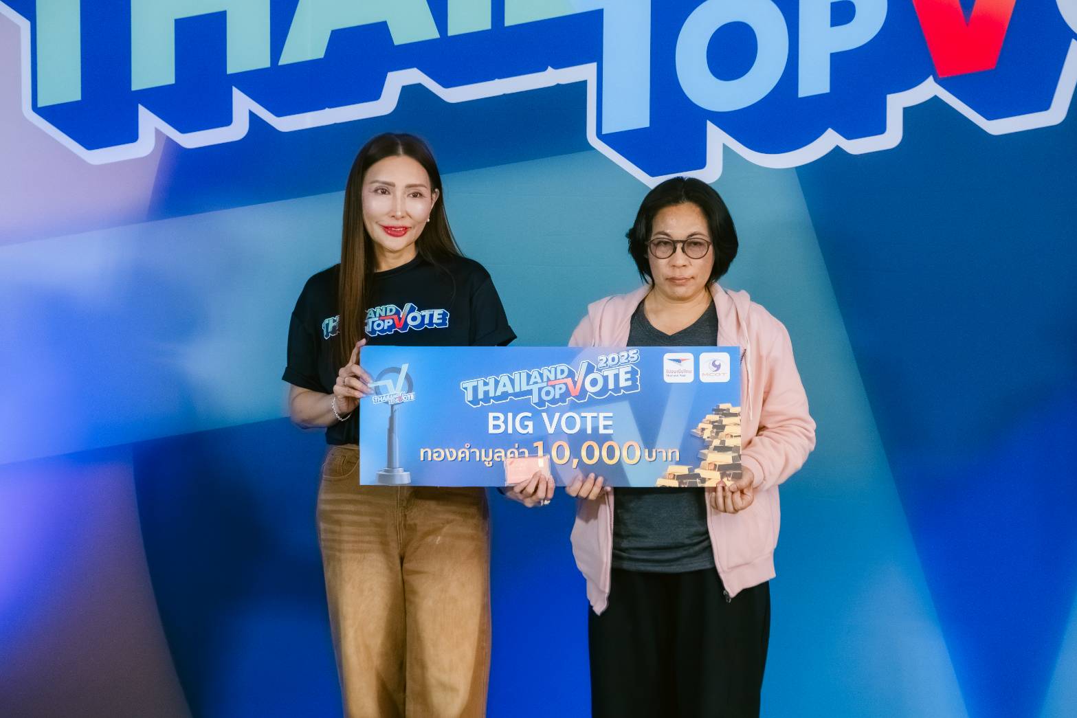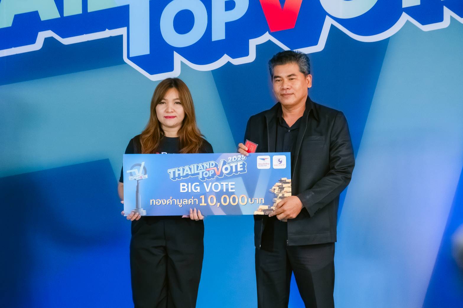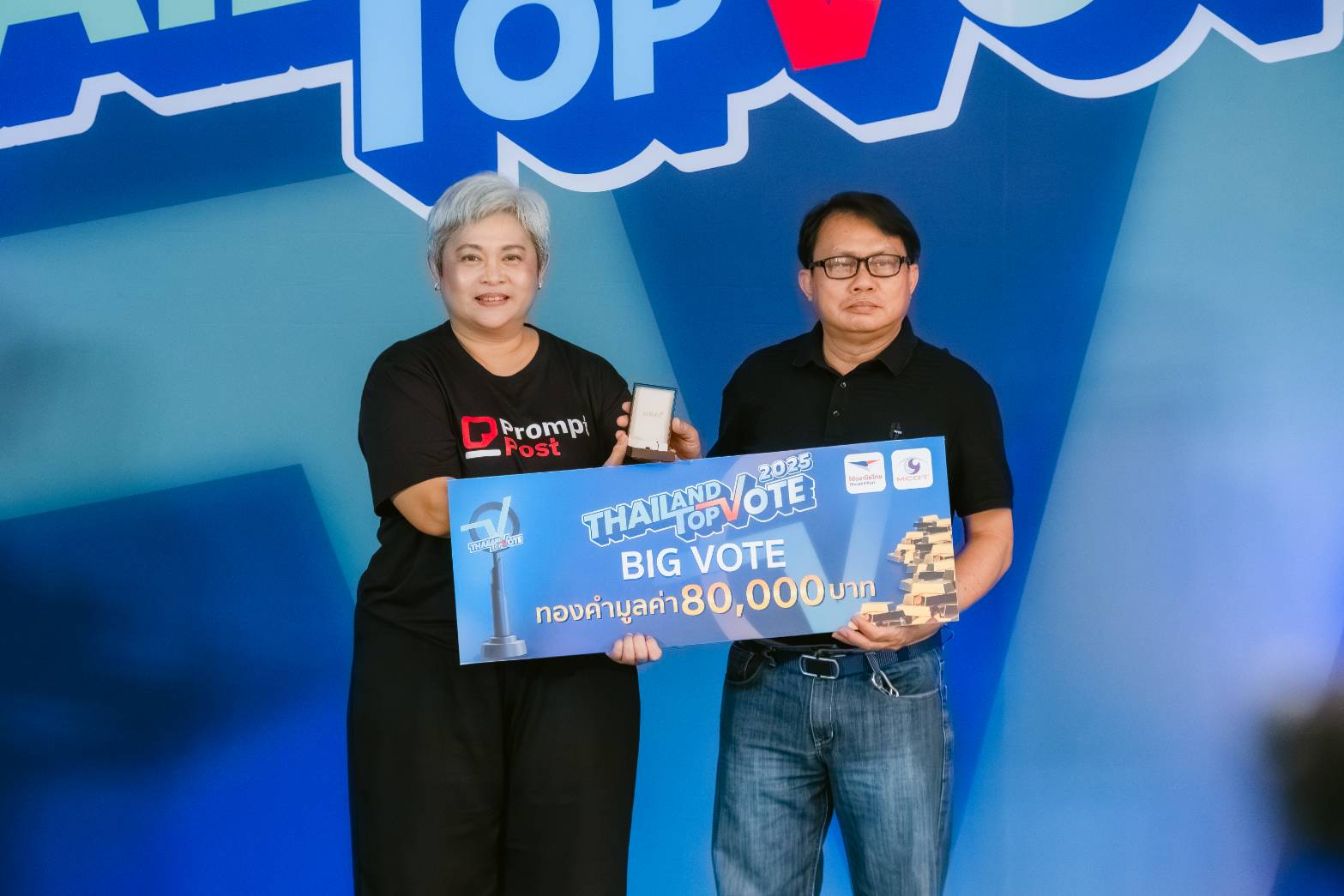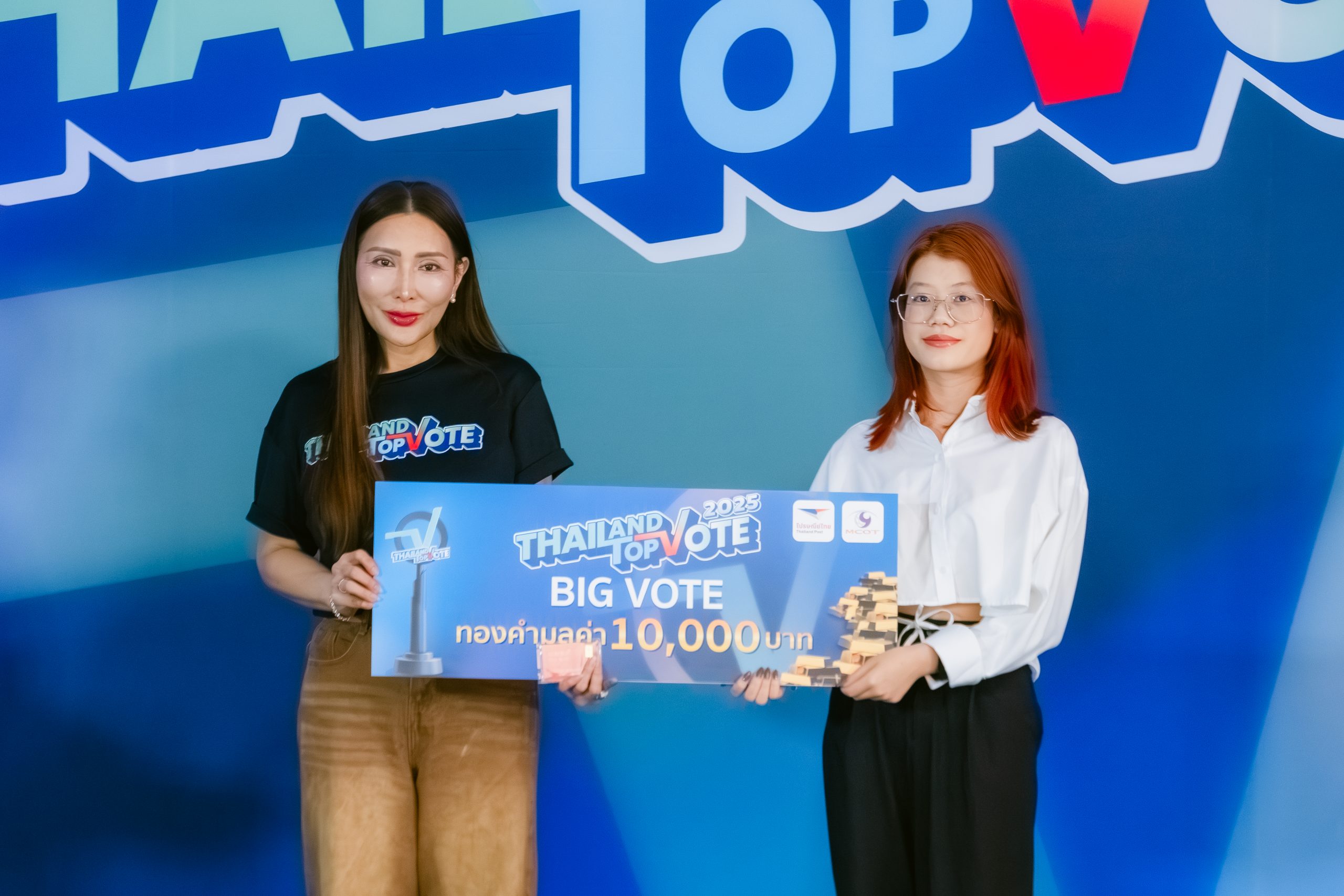 สิ้นสุดการรอคอยหลังปิดโหวตในแคมเปญ Thailand Top Vote 2025 โดย บริษัท อสมท จำกัด (มหาชน) ร่วมกับ บริษัท ไปรษณีย์ไทย จำกัด นำโดย คุณสุวิทย์ ทรัพย์มหาอุดม ผู้ช่วยกรรมการผู้อำนวยการใหญ่ สำนักวิทยุ บริษัท อสมท จำกัด (มหาชน) และ คุณนวรัตน์ อัจฉริยวงศ์เมธี ผู้ช่วยผู้จัดการฝ่ายโพสต์เน็กซ์ บริษัท ไปรษณีย์ไทย จำกัด ร่วมแสดงความยินดี และมองทองคำให้กับ ผู้ที่ร่วมโหวตสูงสุด 10 ลำดับ รวม 10 รางวัล รับทองคำรวมมูลค่า 400,000 บาท